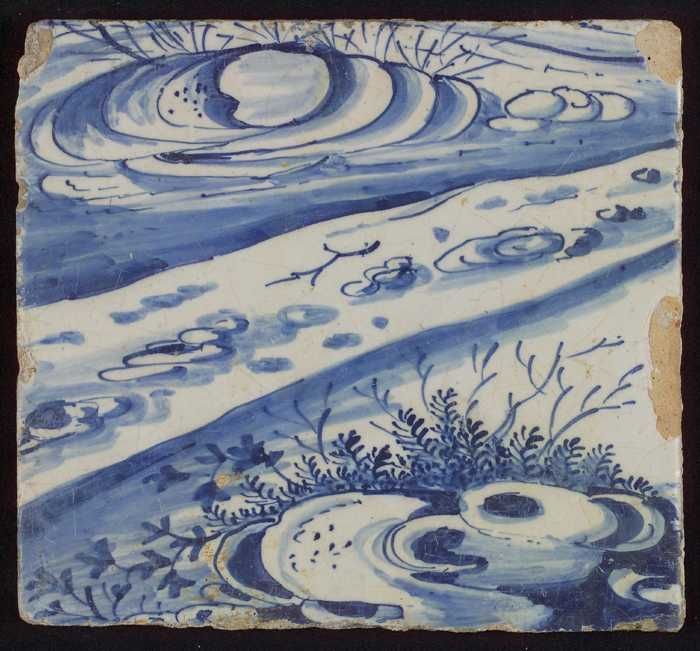 Tegel met in blauw geplooide stof en landschapje