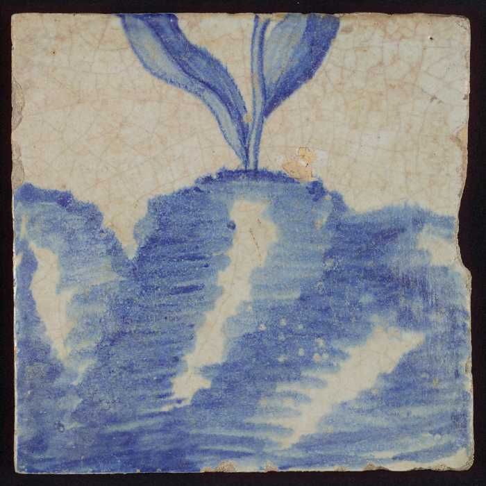 Tegel met blauwe bloemensteel op heuveltje