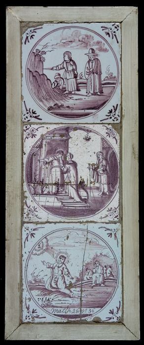 Drie tegels van tableau met in blauw geharnaste tors...