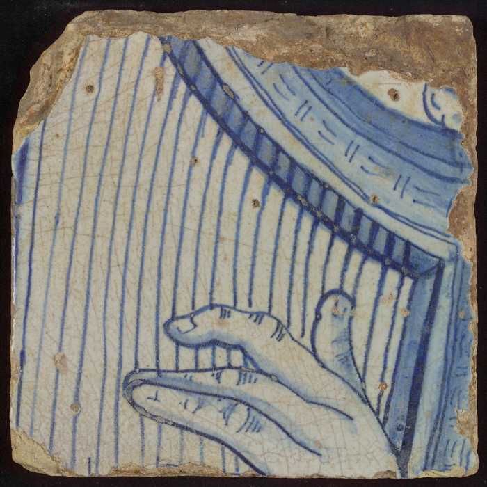 Tegel met in blauw harp en hand