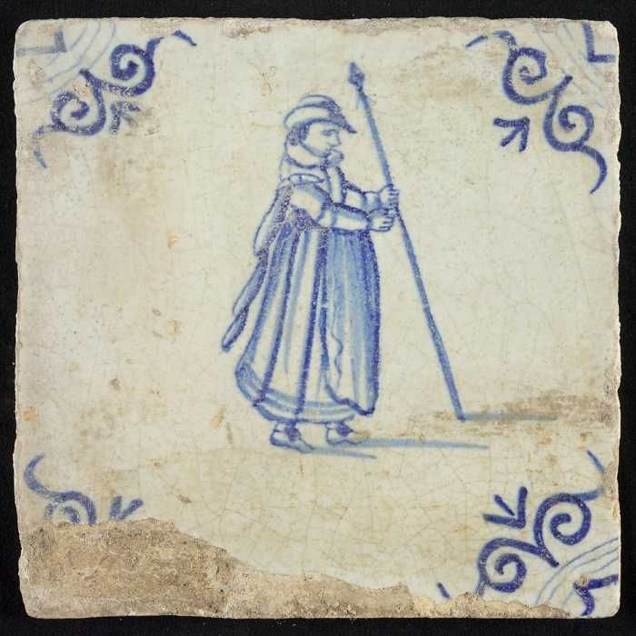 Figuurtegel, staande monnik met lans, hoekmotief oss...