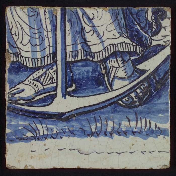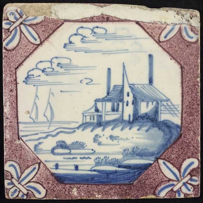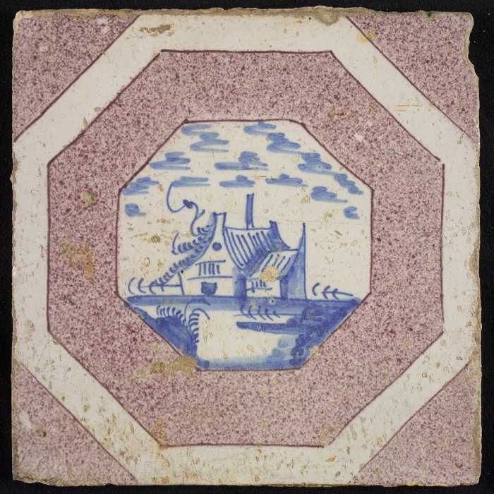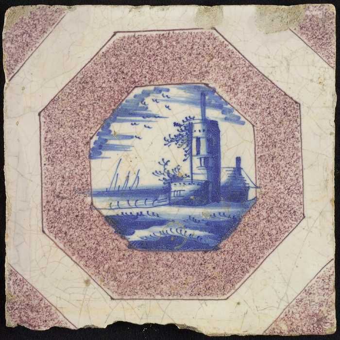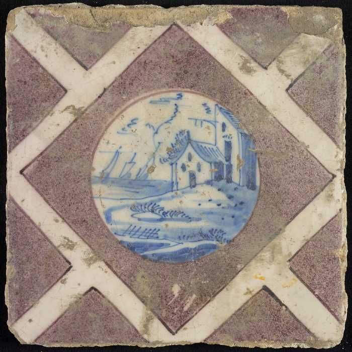 Tafereeltegel, huis, toren en zeilschepen, hoekmotie...