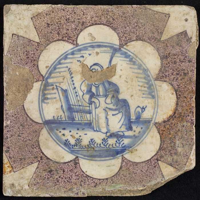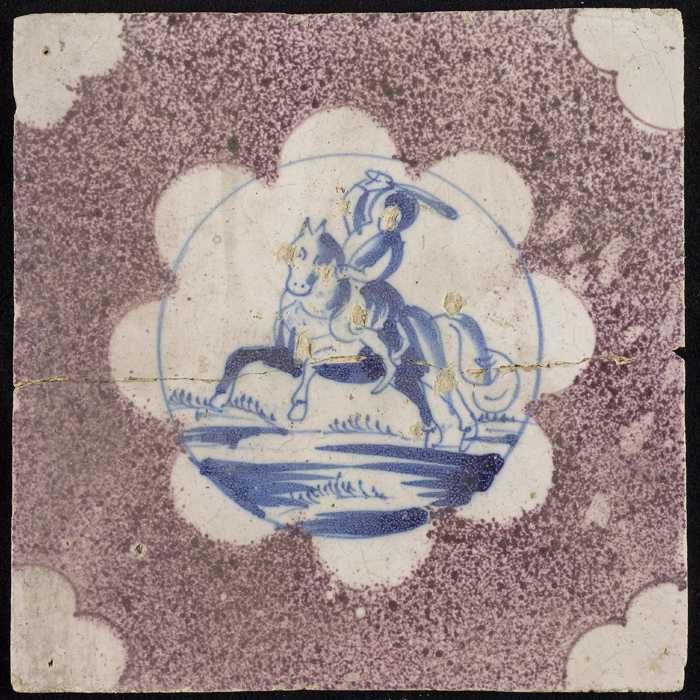 Figuurtegel, man met zwaard te paard, hoekmotief uit...