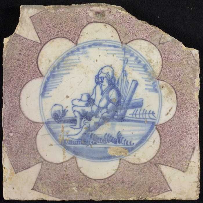 Tafereeltegel, zittende man in landschap, hoekmotief...