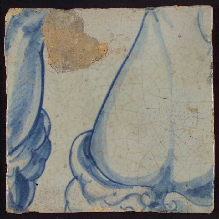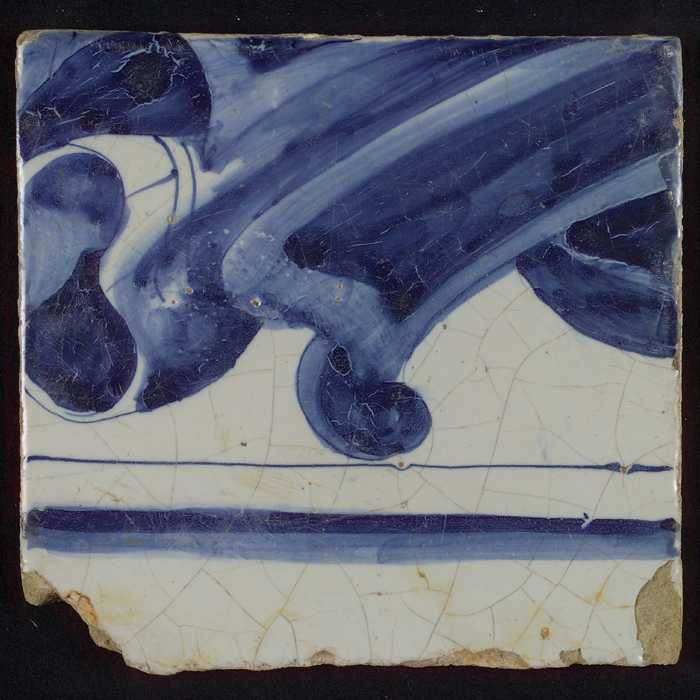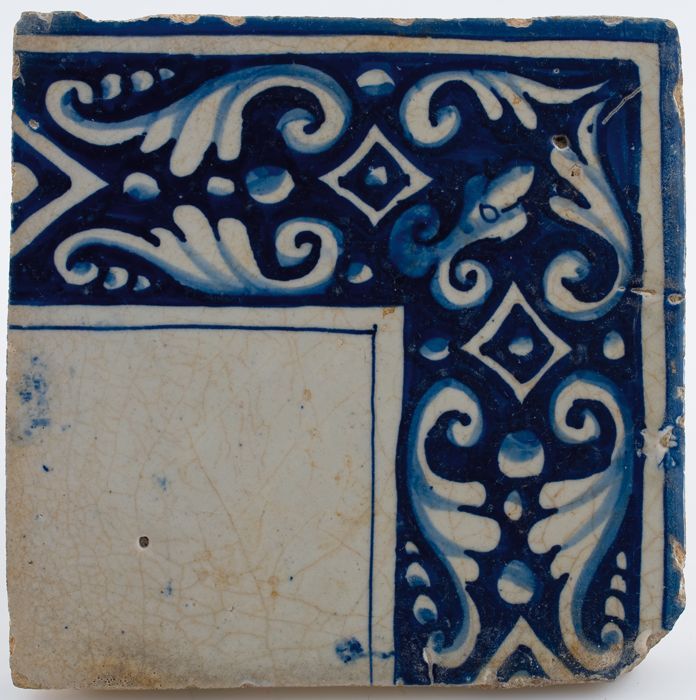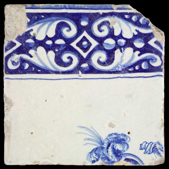 Tegel, in blauw op wit, onder een ornamentrand, daar...