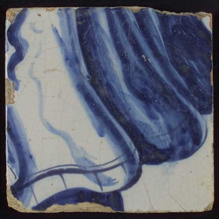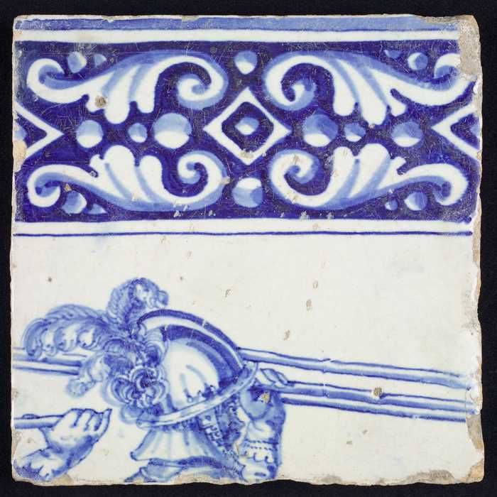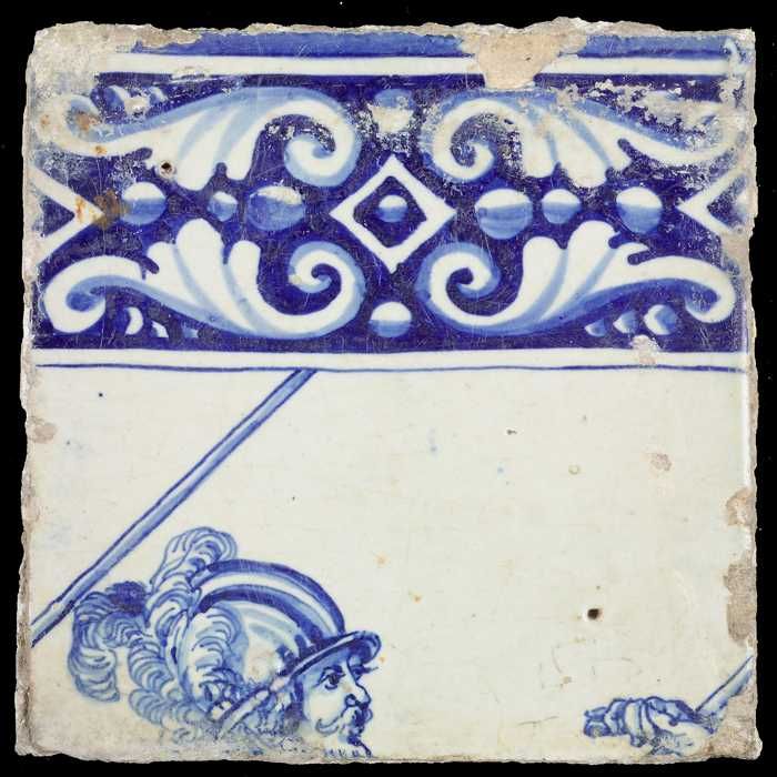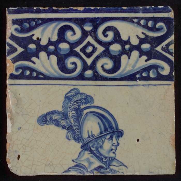 Tegel, in blauw op wit, tors van een soldaat met har...