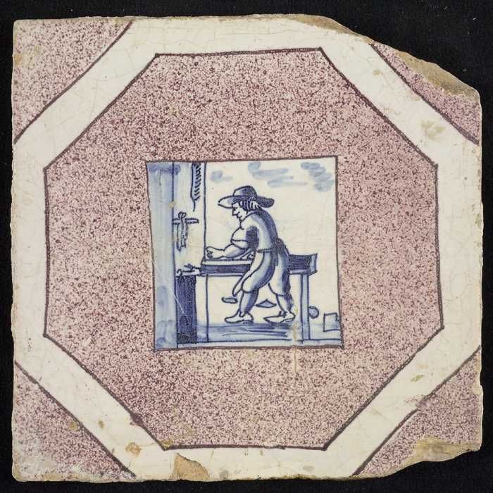 Figuurtegel, schavende man aan werkbank
