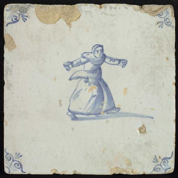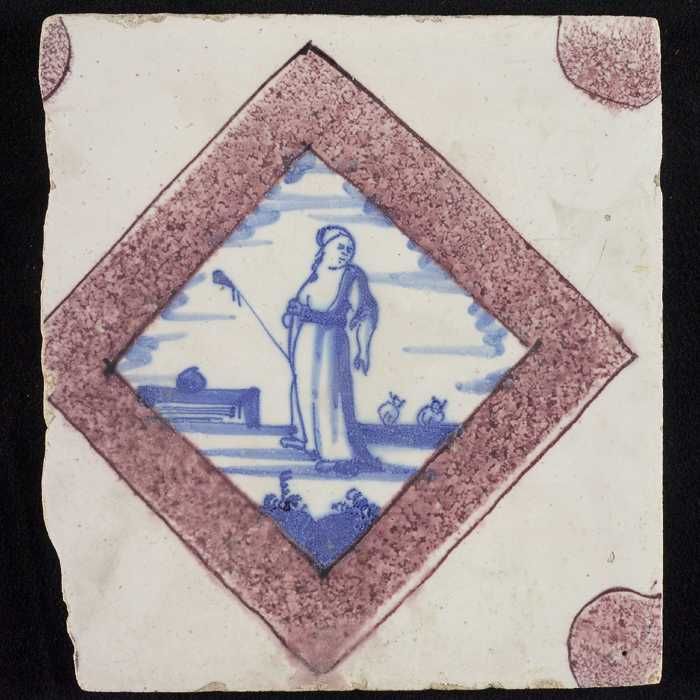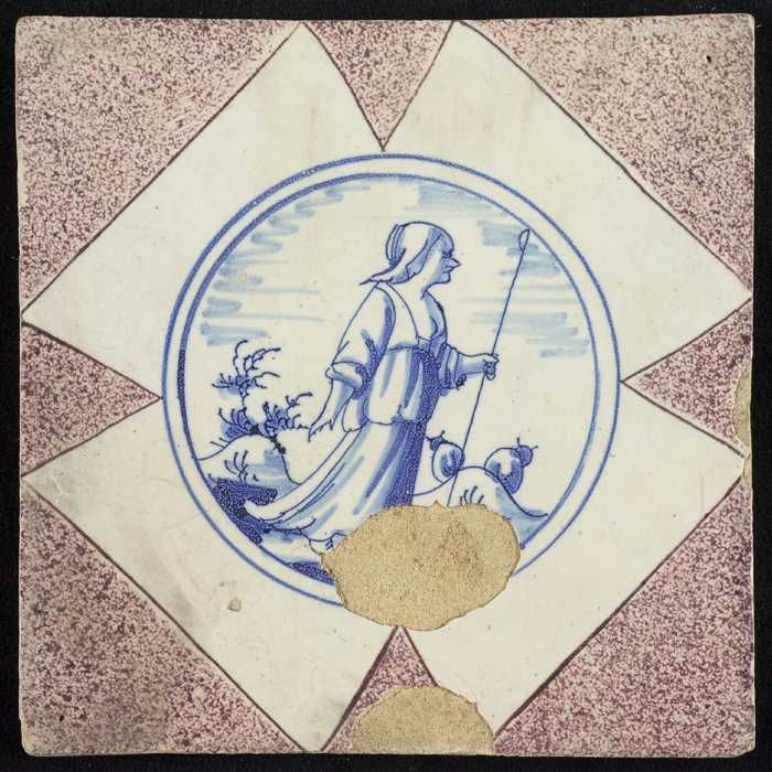 Figuurtegel, herderin met staf, hoekmotief half paar...