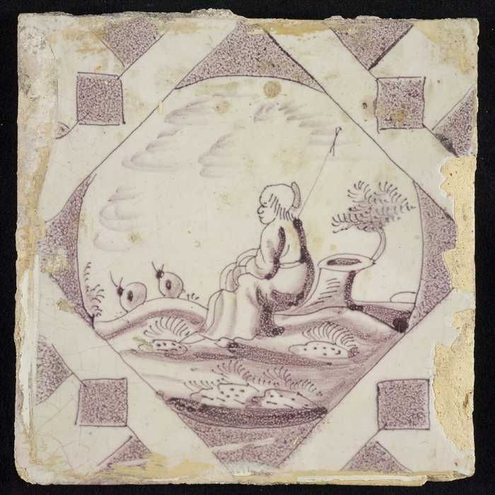 Tafereeltegel, zittende vrouw in landschap, hoekmoti...