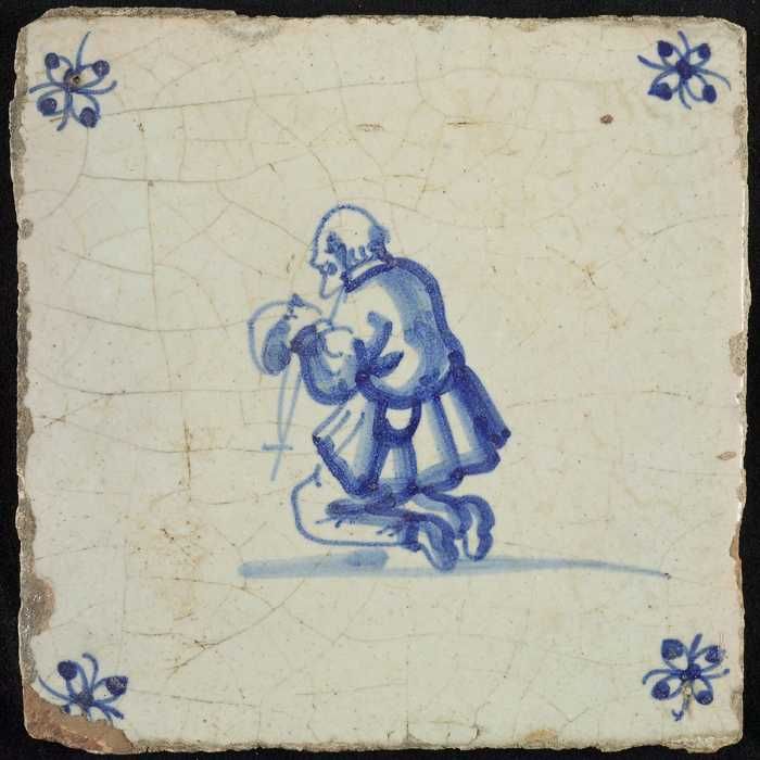 Figuurtegel, knielende man met rozenkrans, hoekmotie...
