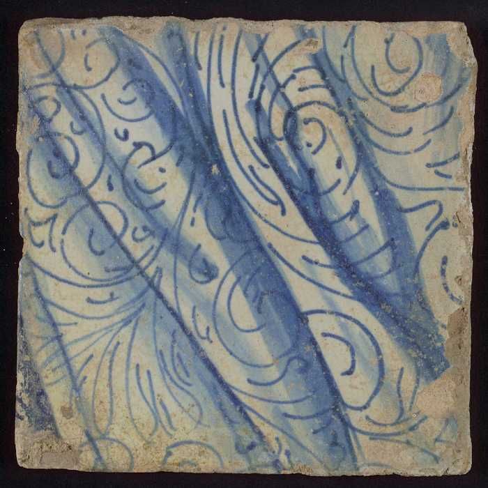Tegel met blauwe golvende lijnen en decoratie