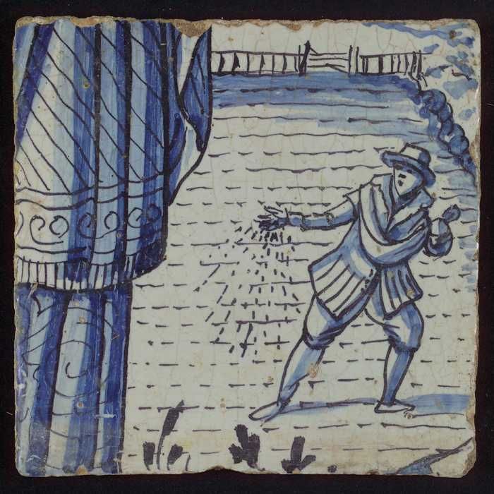 Tegel uit tableau 'Hoop' met in blauw zaaier op land