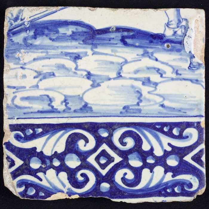 Tegel, in blauw op wit, onder ornamentrand, daarbove...