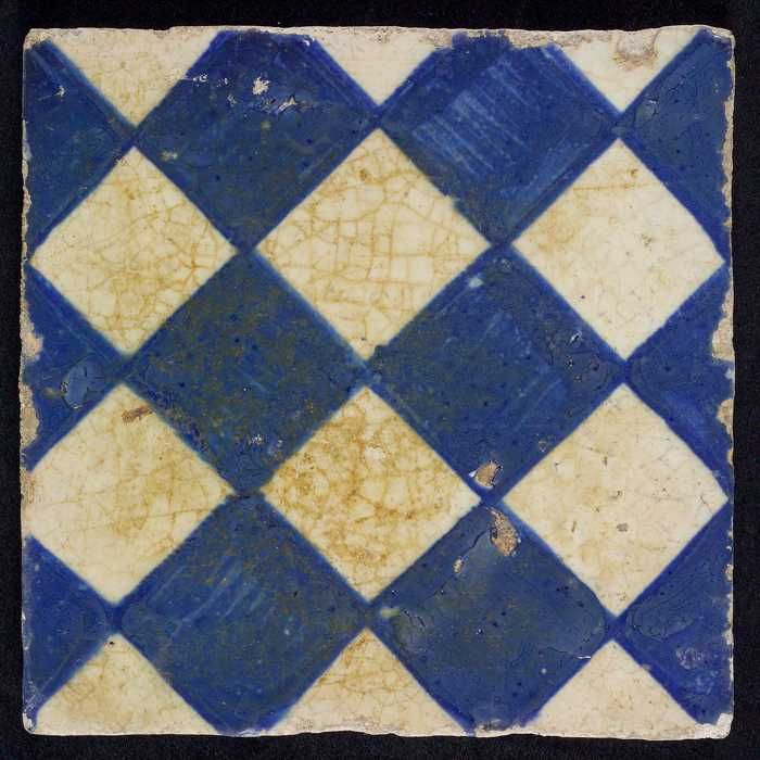 Ornamenttegel, blauw op wit, centraal decor, dambord...
