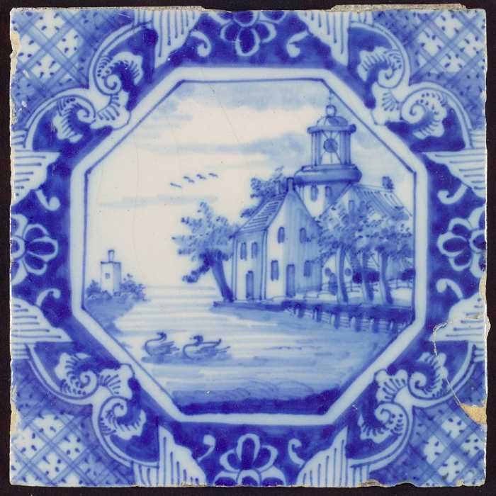 Tafereeltegel, landschap, huis met kerk en bomen, in...