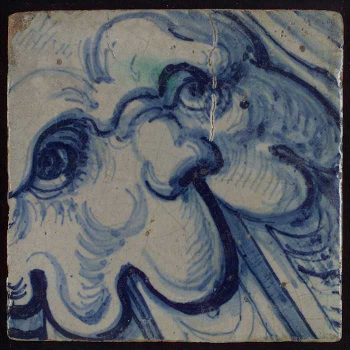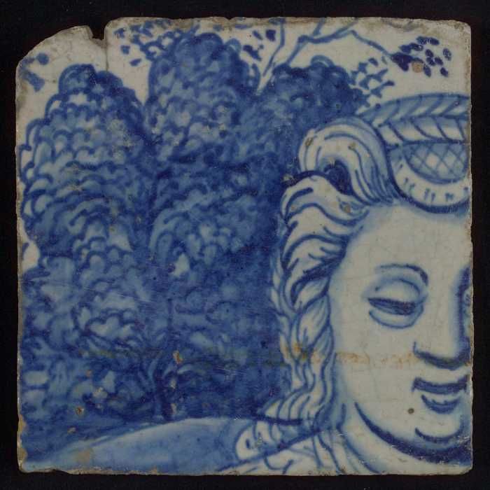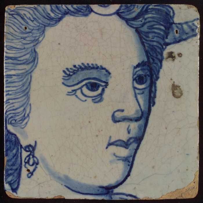 Tegel met blauw portret van man met snor, Gaius Muci...