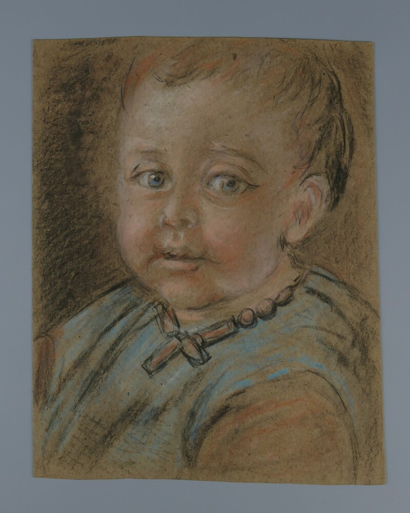 Pasteltekening op papier voorstellende kinderkopje, ...