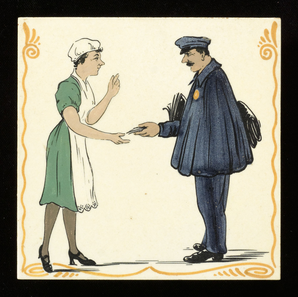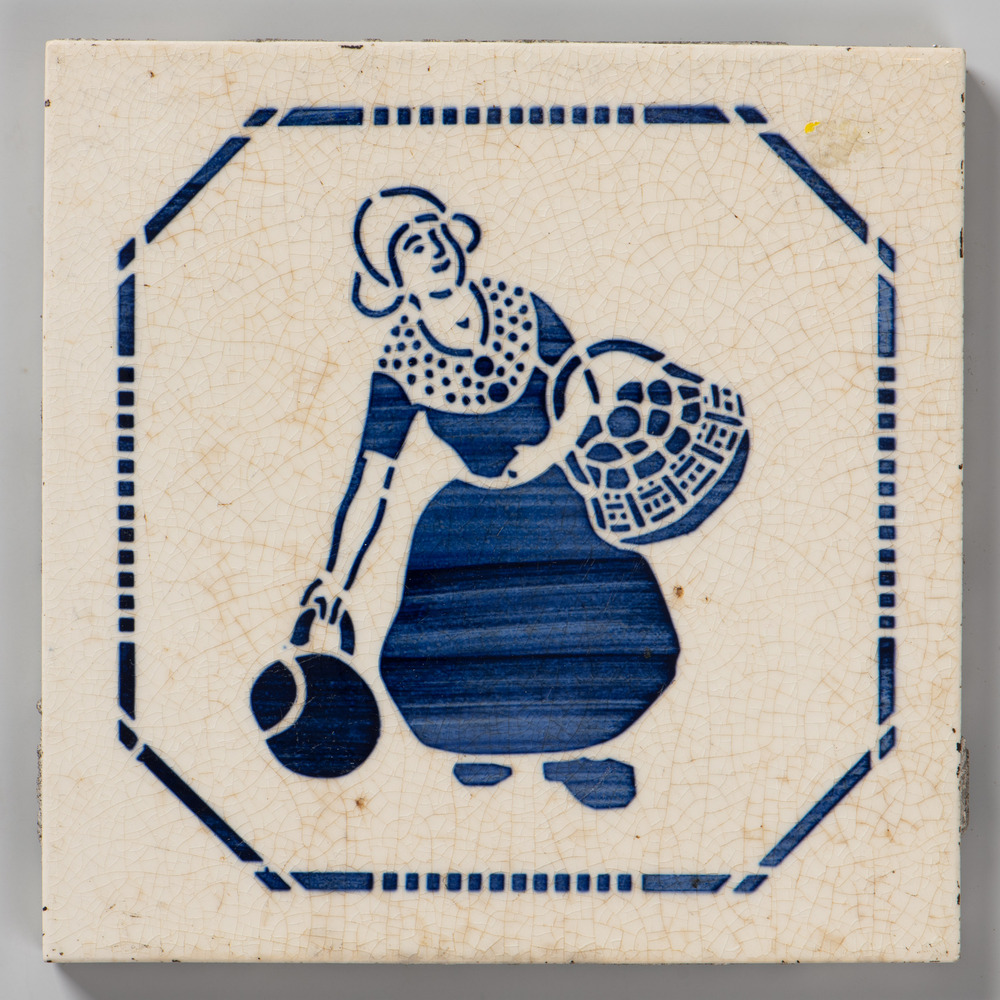 Tegel, gesjabloneerd, met voorstelling: vrouw met ma...