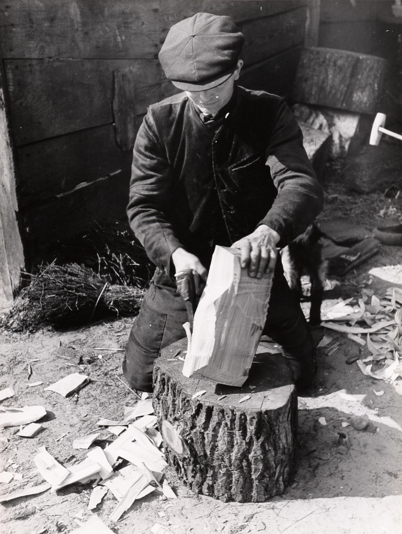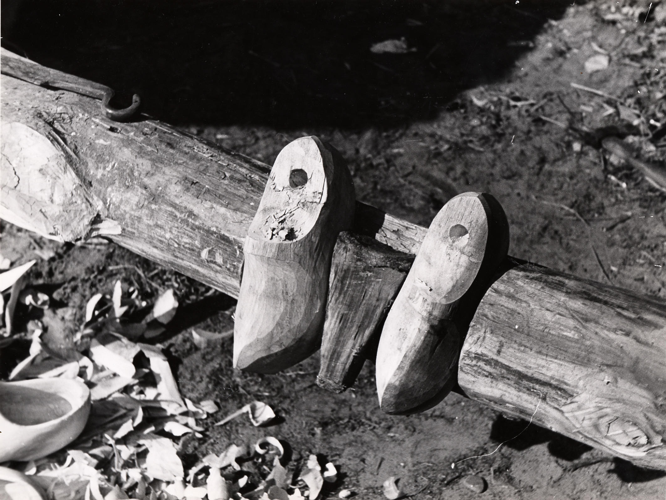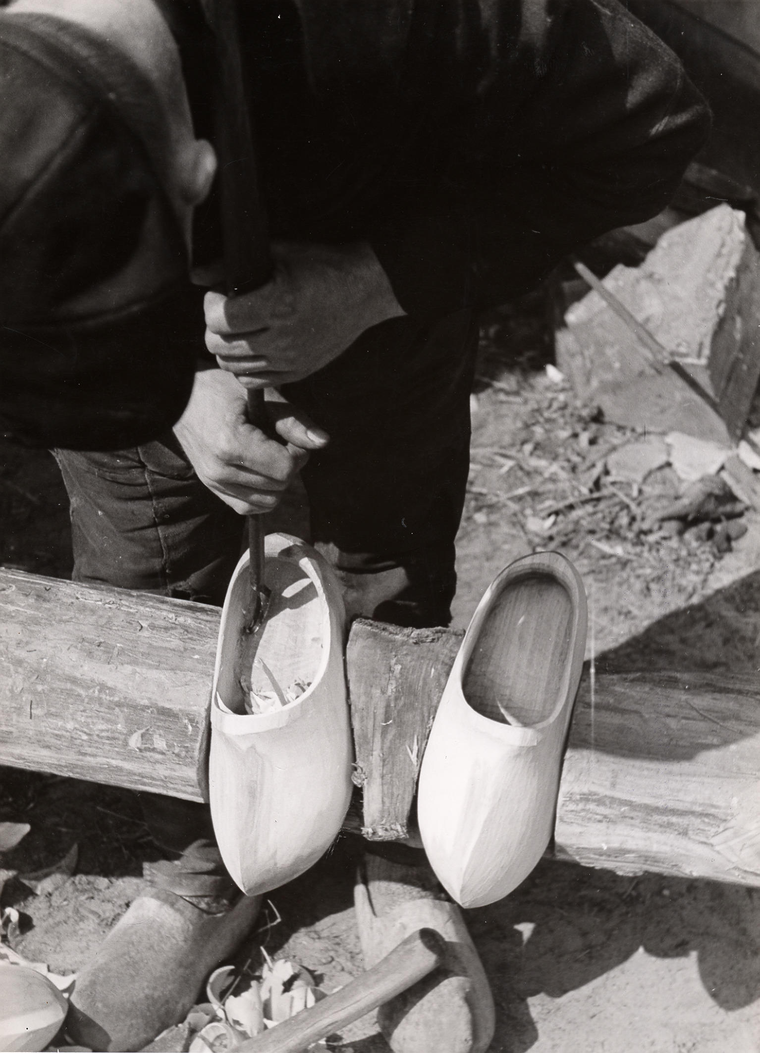 Klompen in het klompenblok, Staphorst, 1944 (zwart-w...