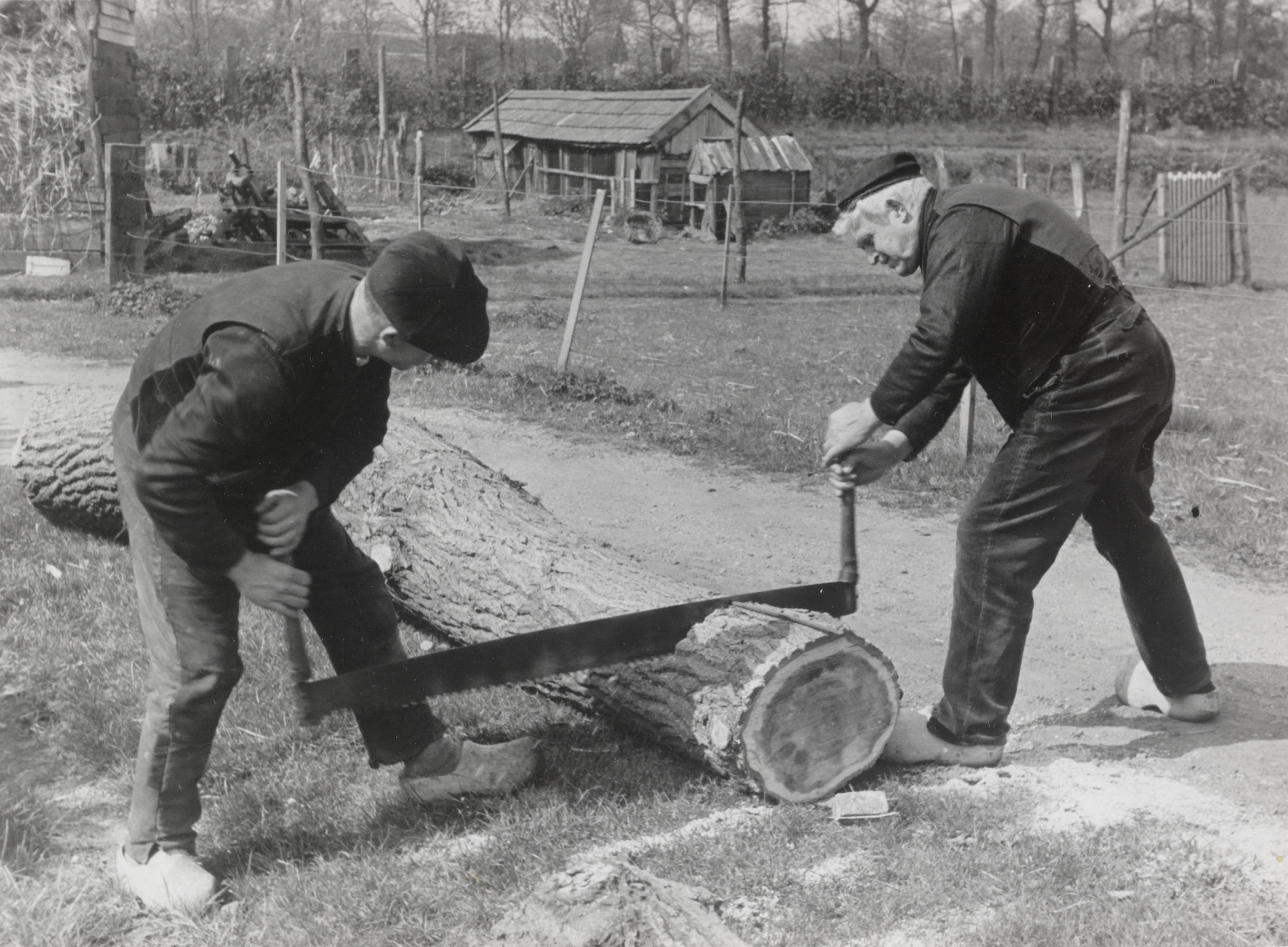 Jan Kooiker en Jan Smit aan het zagen, Staphorst, 19...