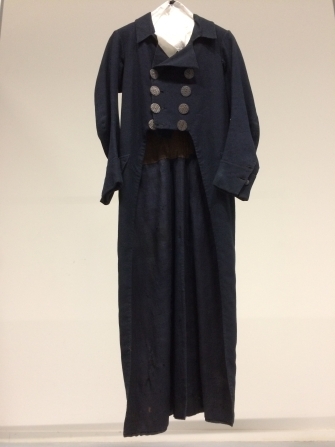 Donkerblauwe frac met lange panden, met bronzen knopen