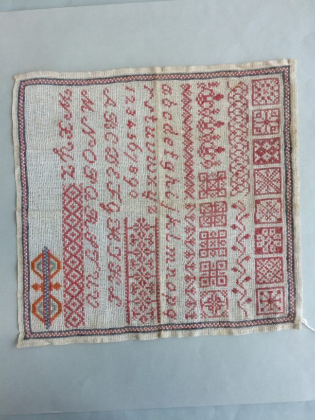 Lettermerklap, in kruissteek en stersteek op katoen,...