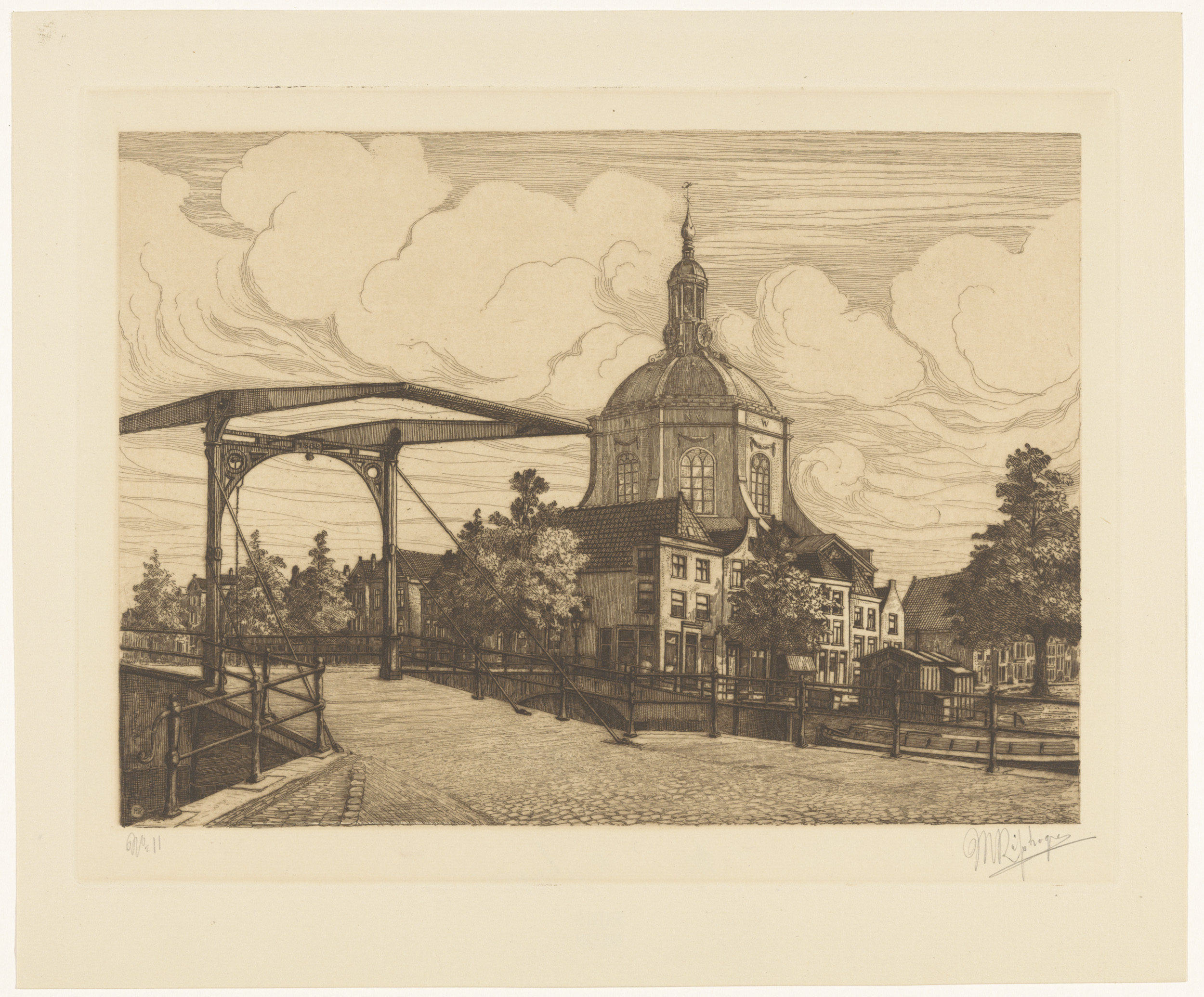 Stadsgezicht met ophaalbrug en Marekerk in Leiden