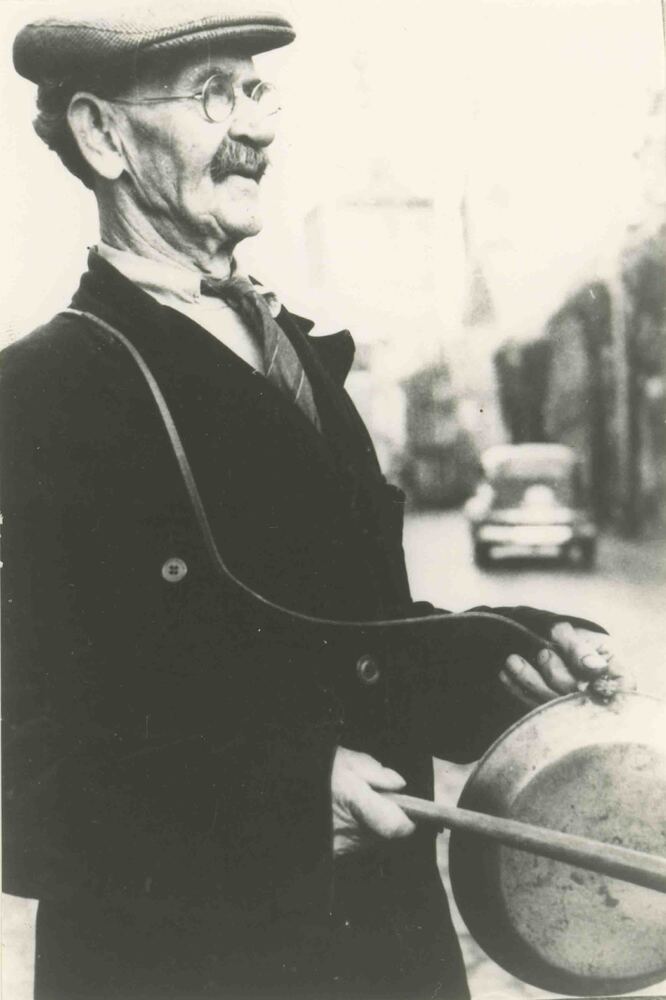 Foto, voorstellende stadsomroeper Manus van Empel te...