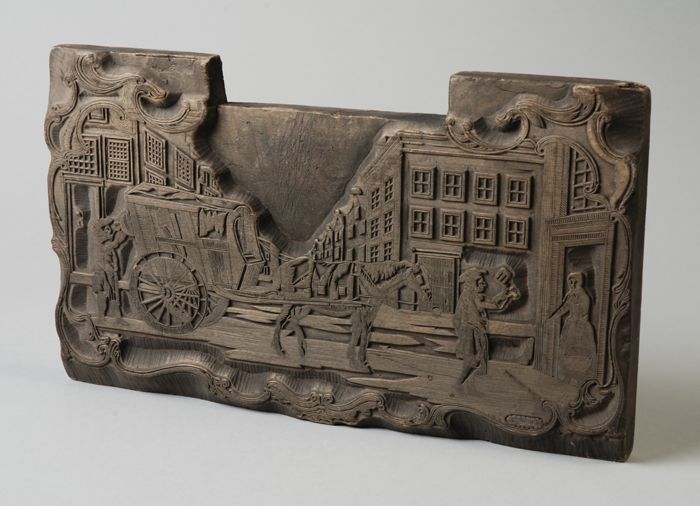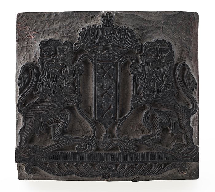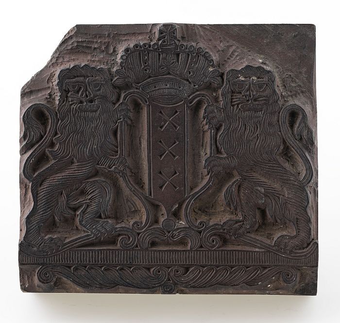Houten cliché voor het wapen van Amsterdam met kroon...
