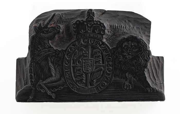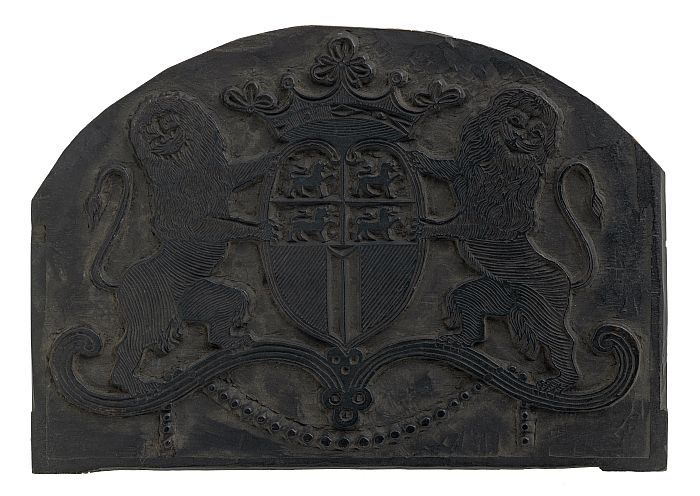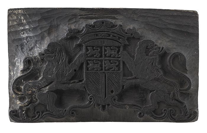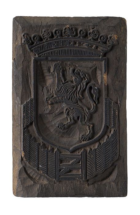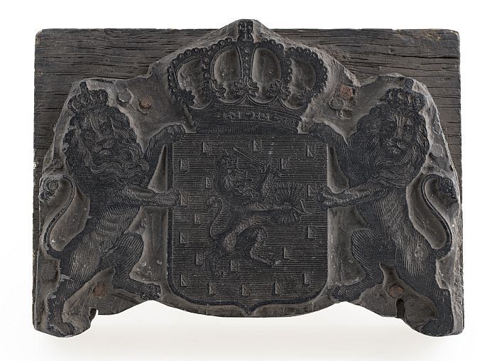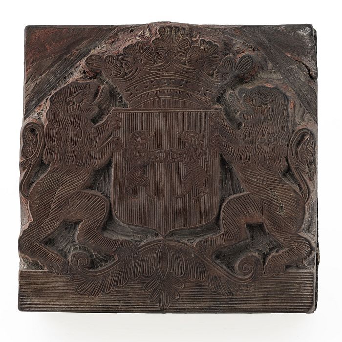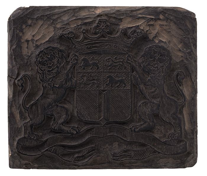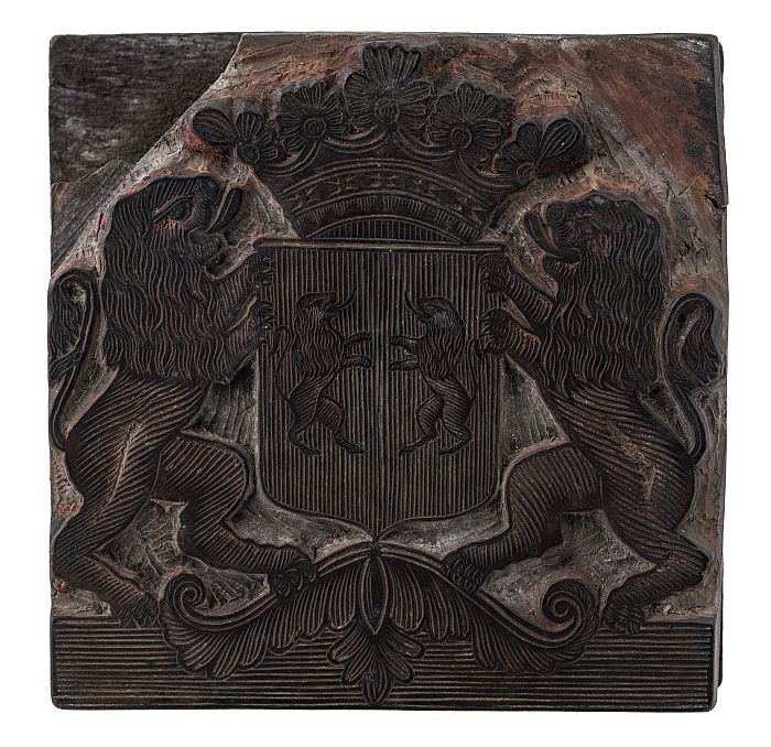 Houten cliché voor gekroond wapen met de leeuw in de...