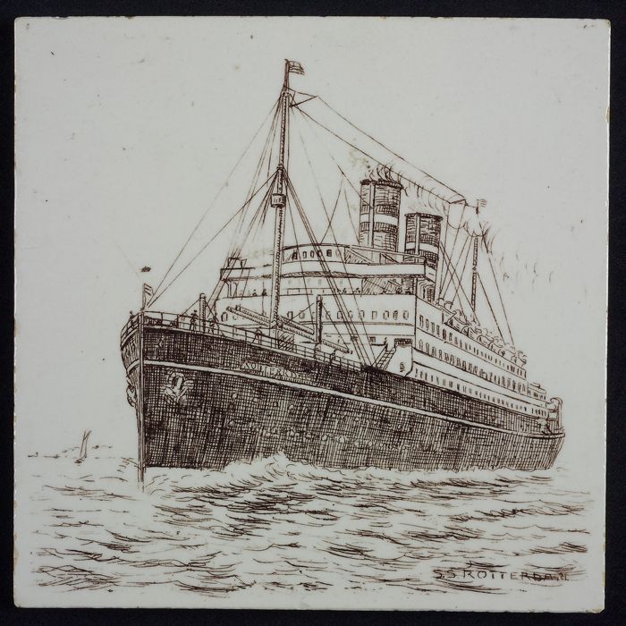 Witte tegel met in zwart het stoomschip Rotterdam (IV)