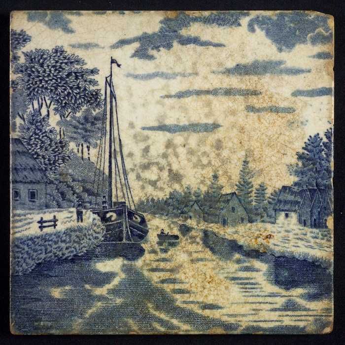 Blauwe tegel met schip op vaart, huizen langs de kant