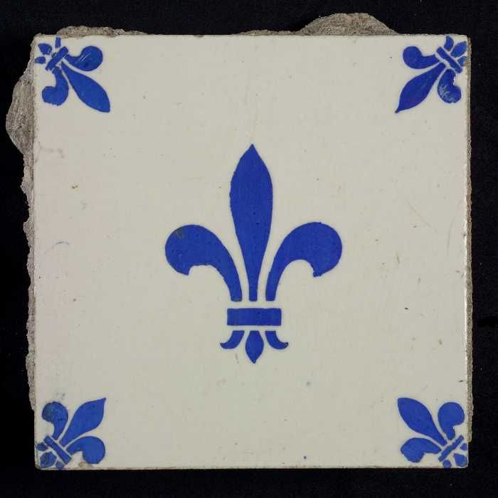 Blauwe tegel met franse lelie in centrum en in ieder...