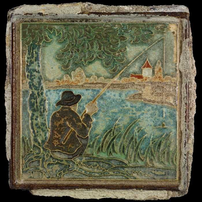 Tegel in reliëf, visser, hengelaar aan waterkant
