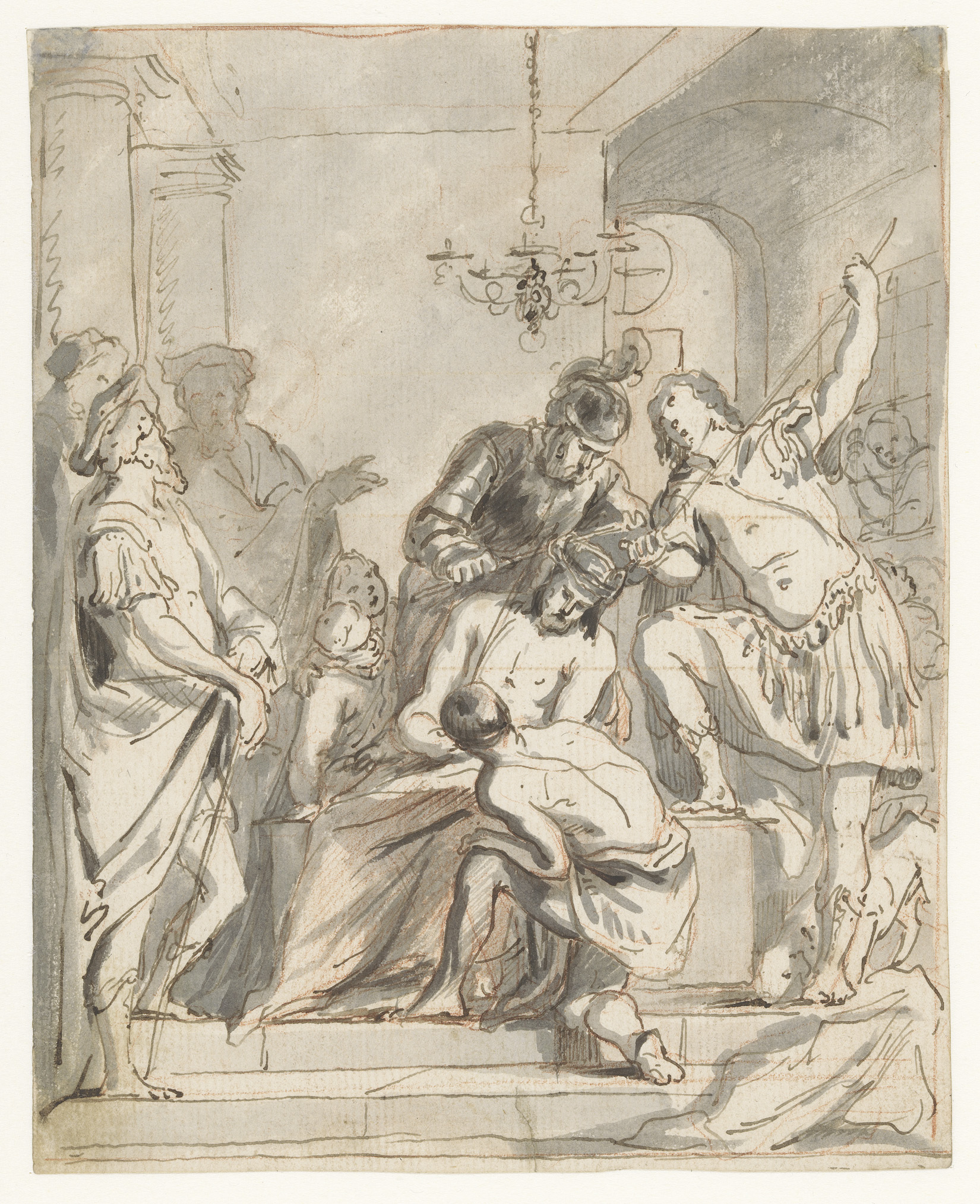 Jongeling geeft een kelk aan een vrouw op een troon