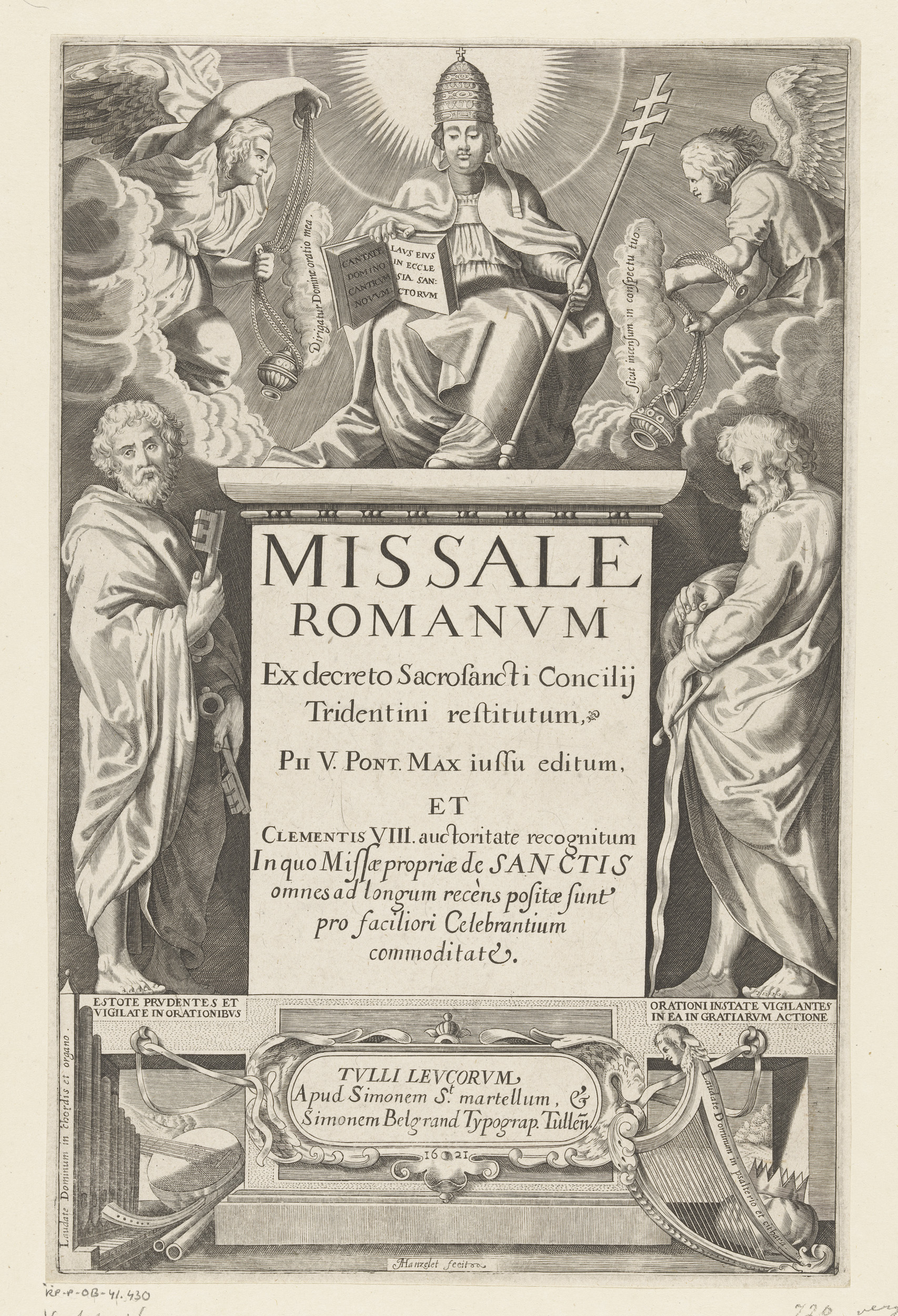 Paus, gezeten op een voetstuk dat geflankeerd wordt ...
