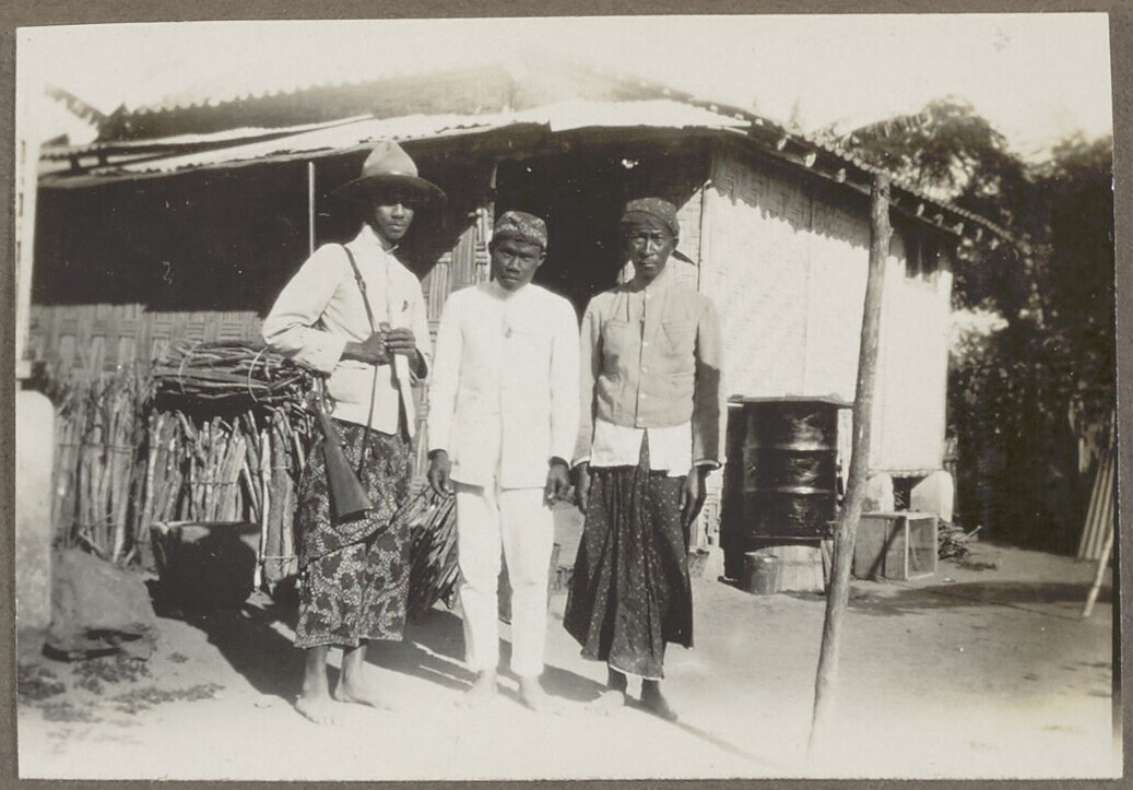 Indonesiërs met geweer voor een hut met takkenbossen