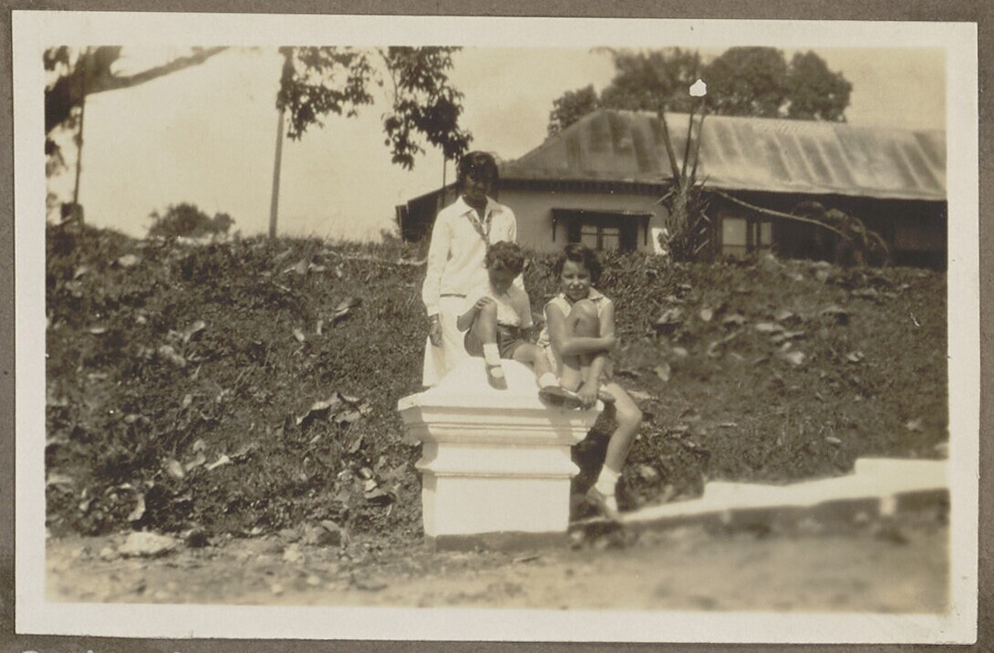 Vrouw met kinderen in de tuin op een stenen monument