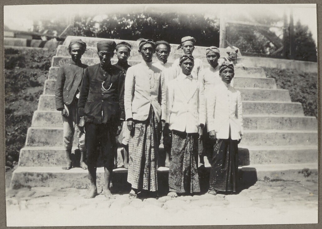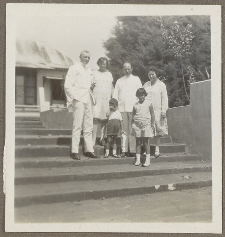 Nederlands en Indisch gezelschap op een trap