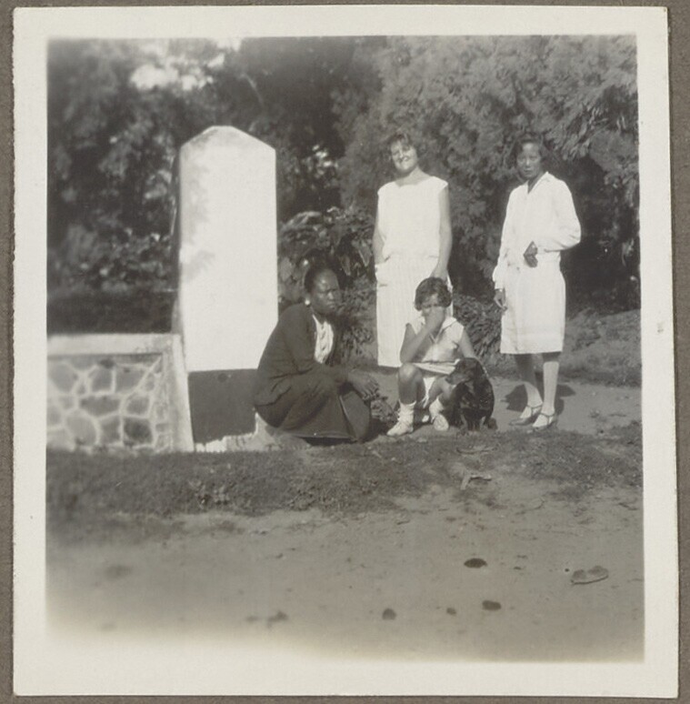 Europees en Indisch gezelschap met hond in een tuin