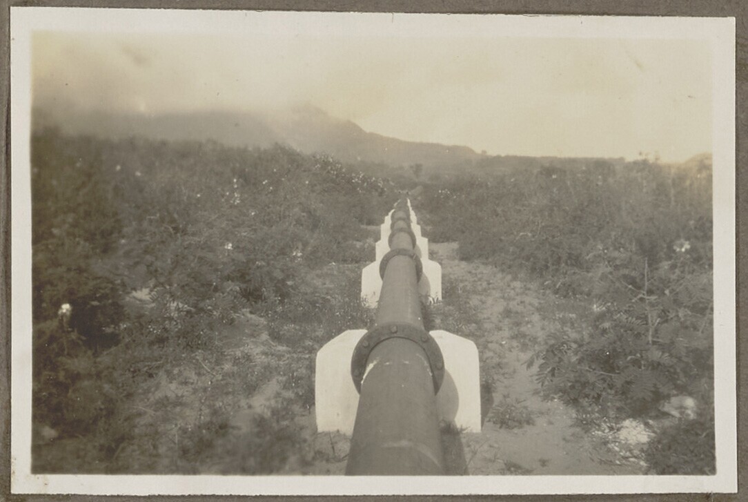 Pijpleiding van theefabriek door akkers