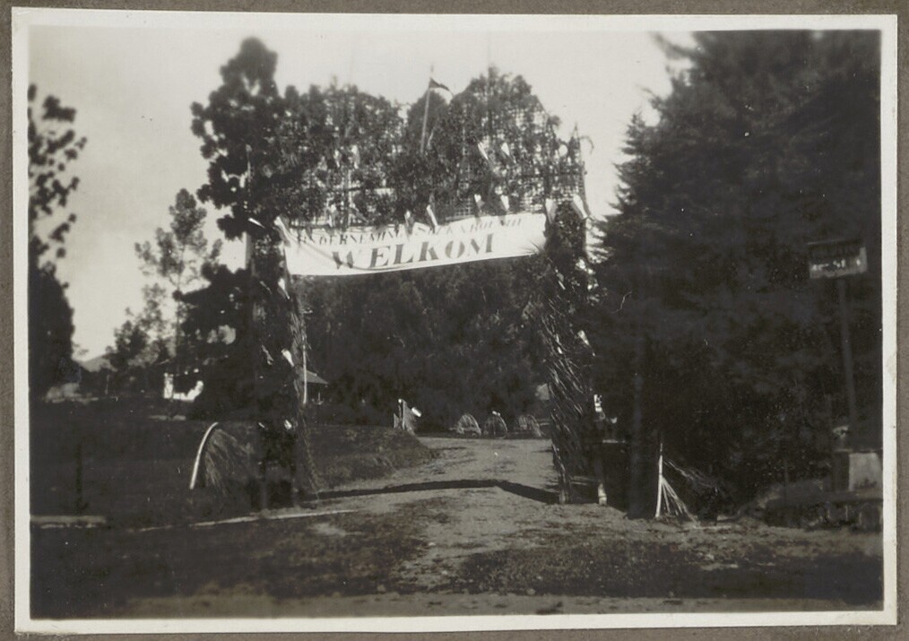 Poort met spandoek waarop Welkom geschreven