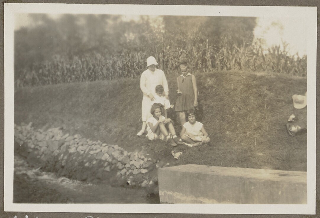 Vrouw met kinderen tussen waterreservoir en akkers