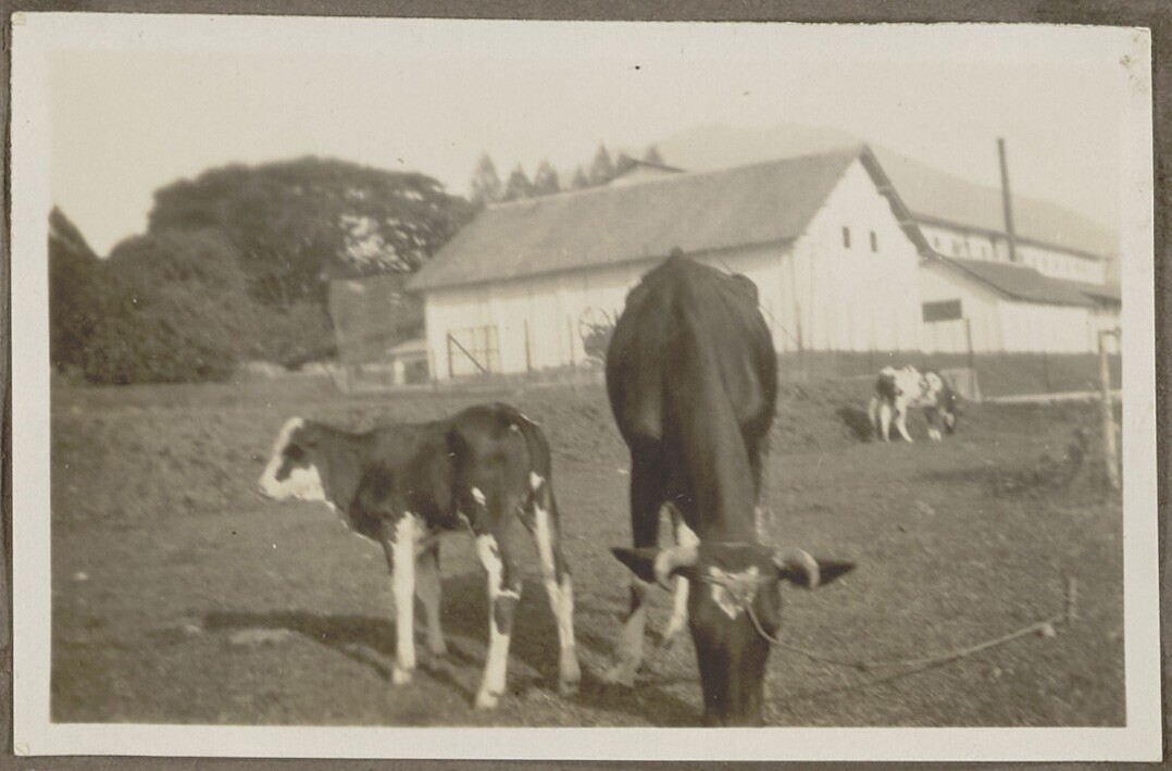 Koeien met theefabriek op de achtergrond
