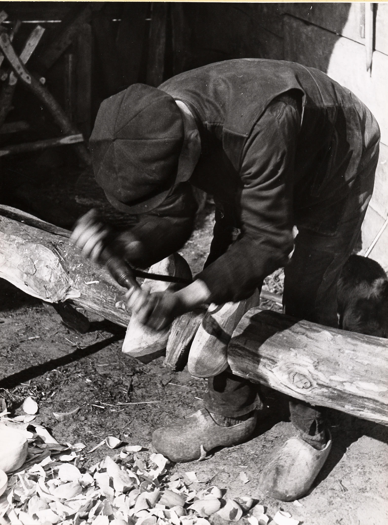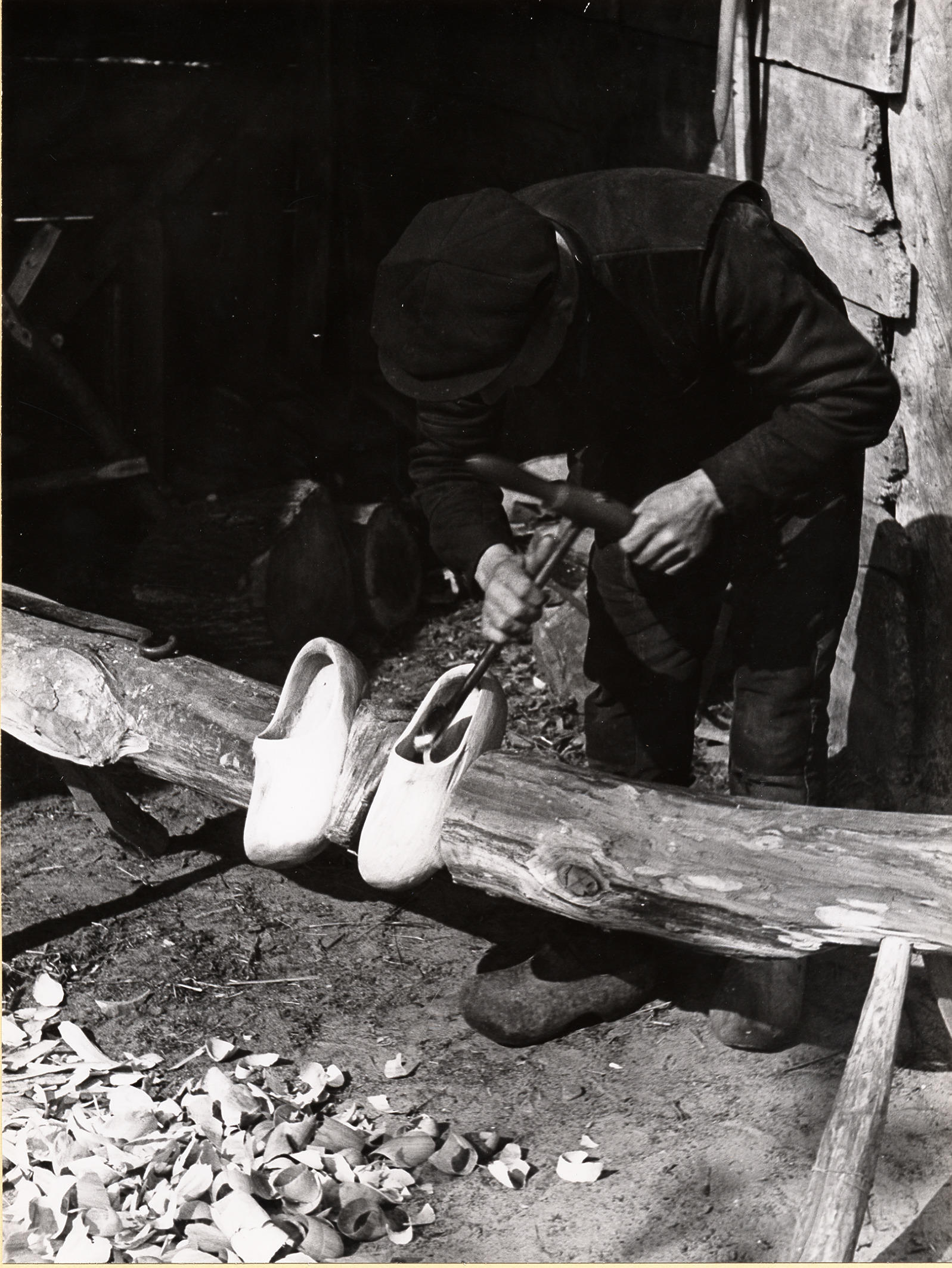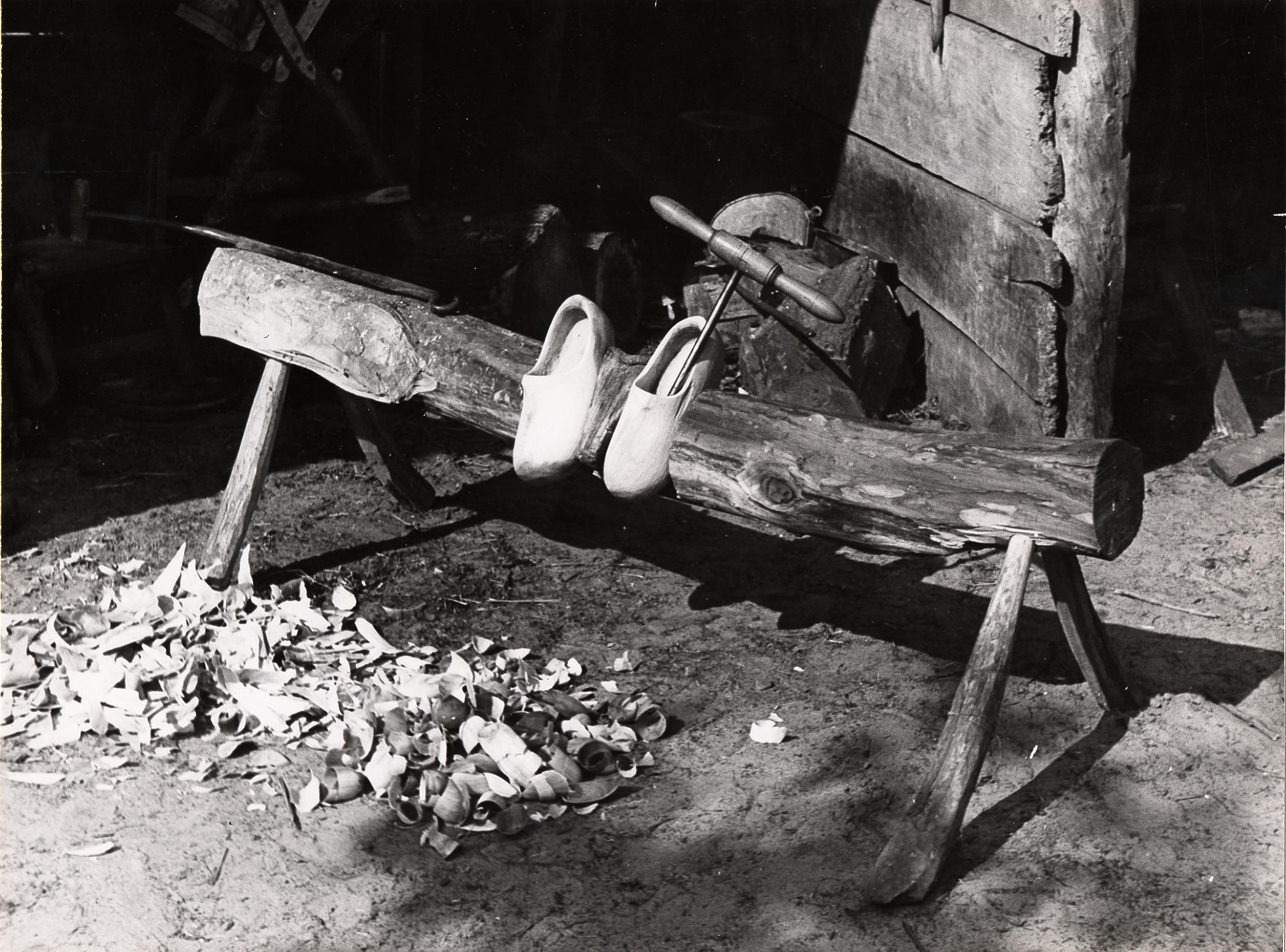 Klompen in het klompenblok, Staphorst, 1944 (zwart-w...
