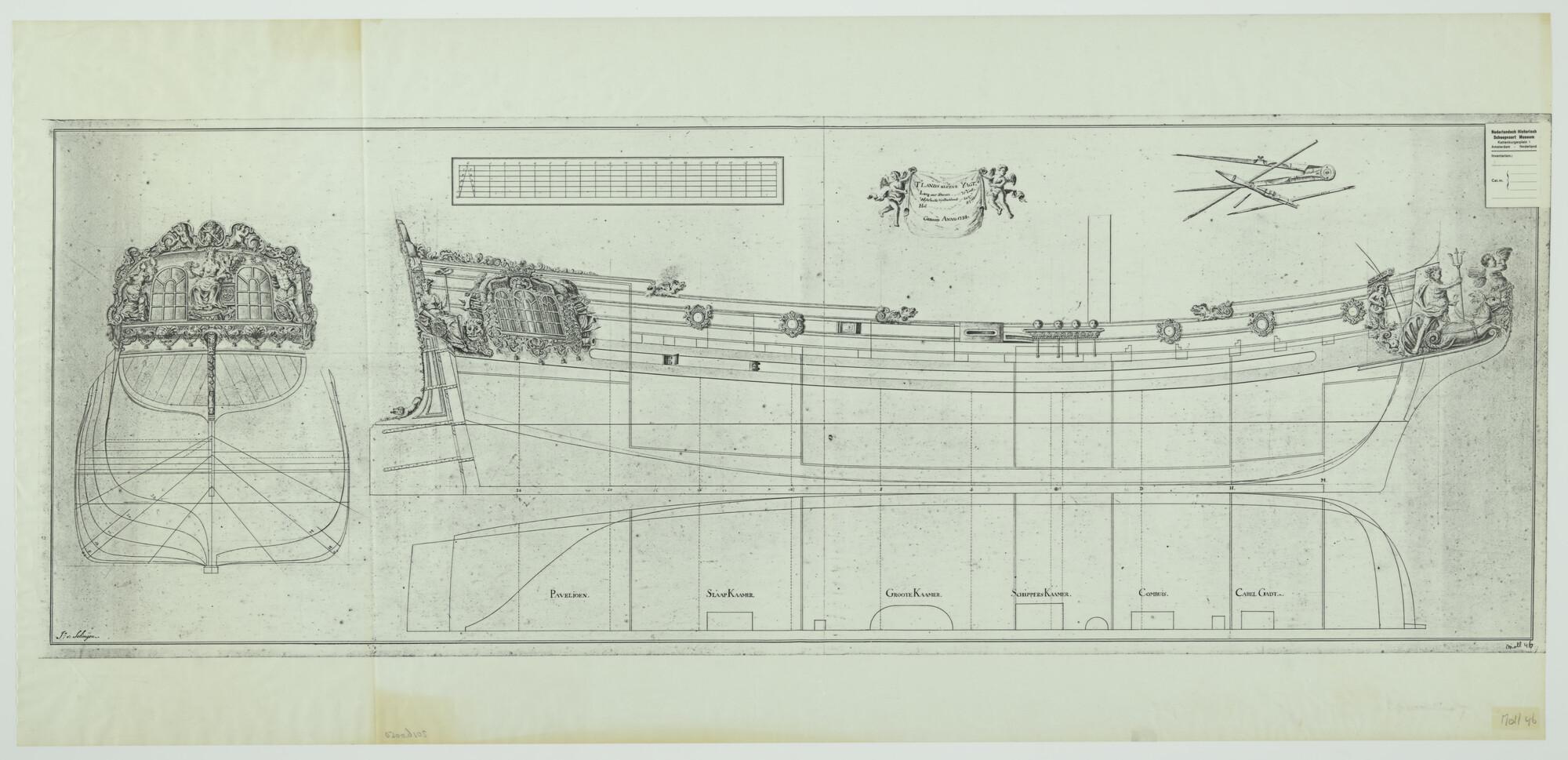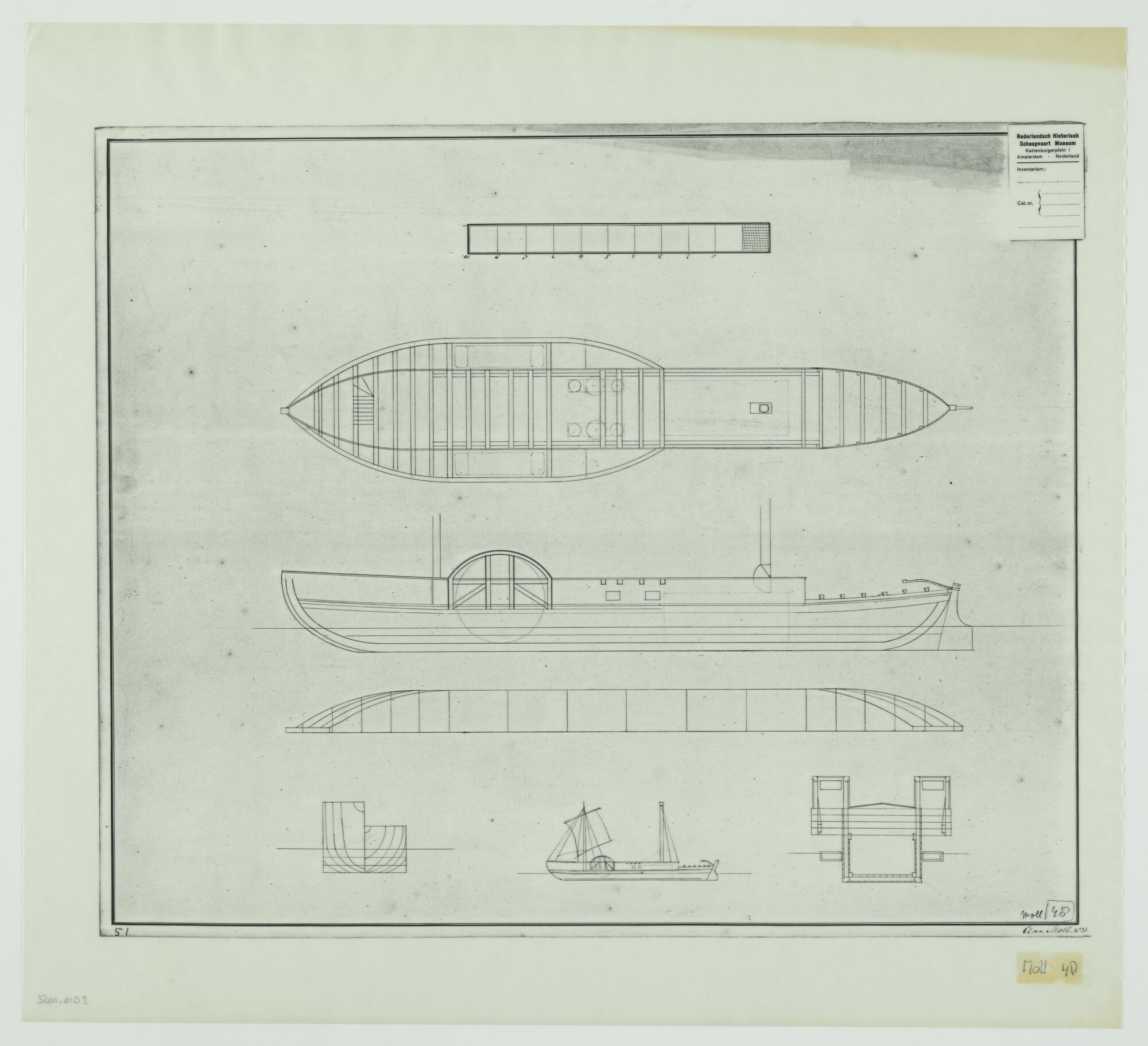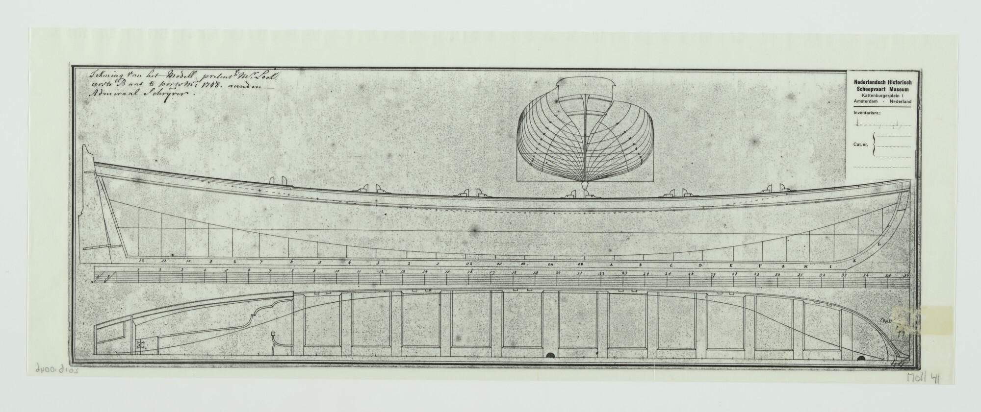 Lijnenplan, spantenraam en aanzichten van een jacht ...