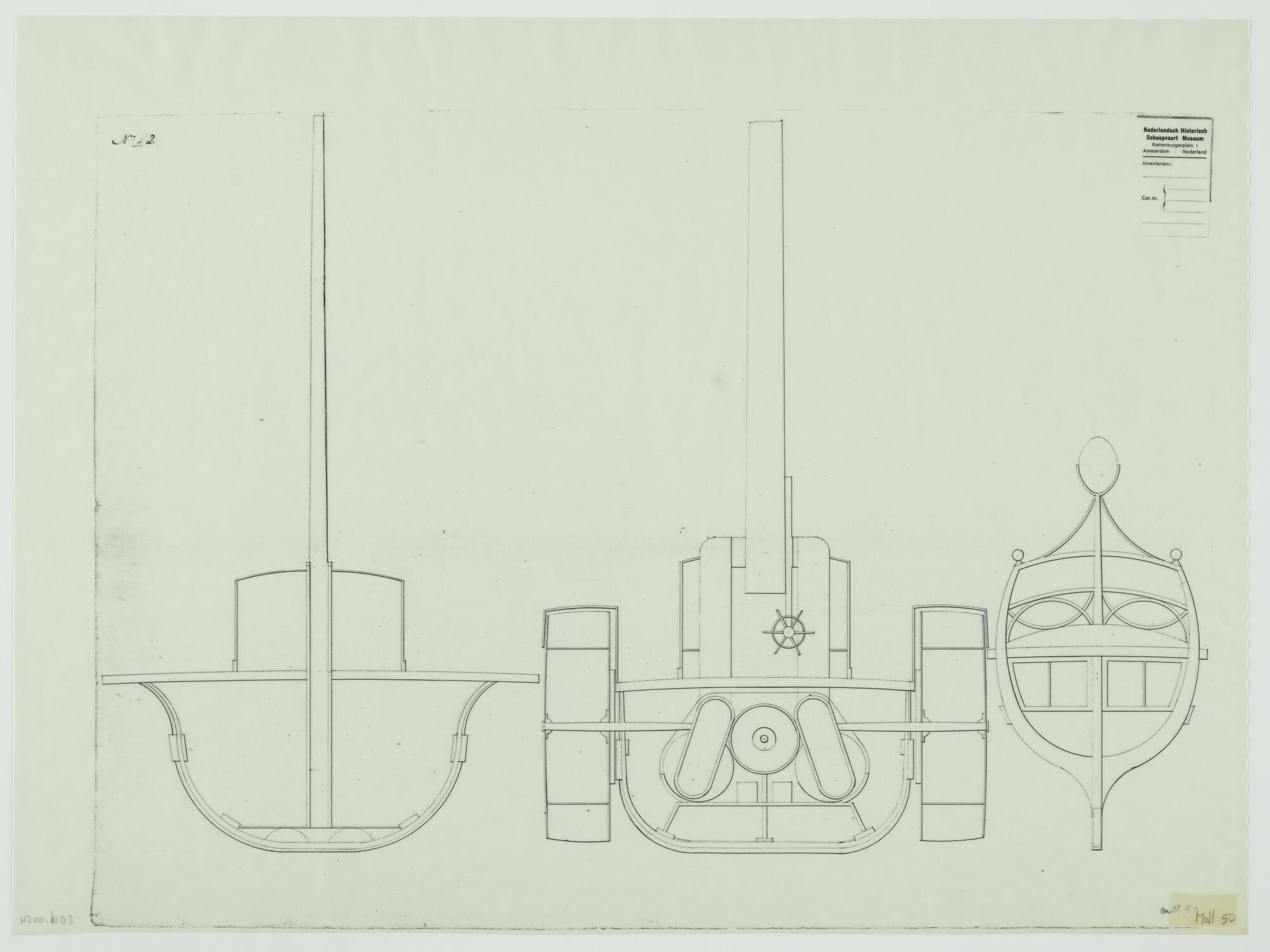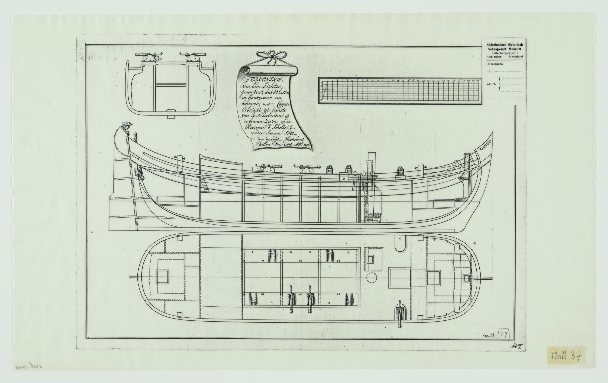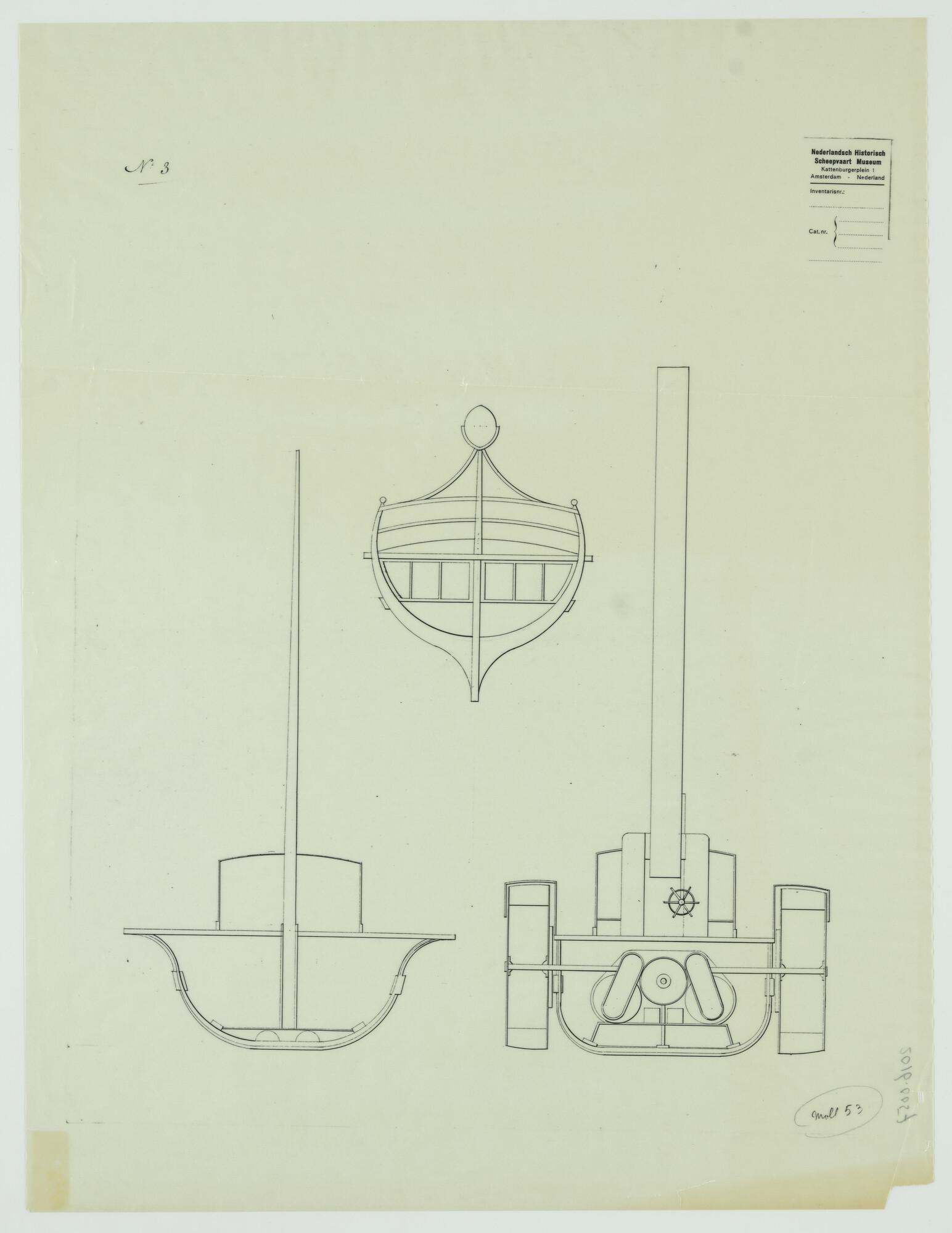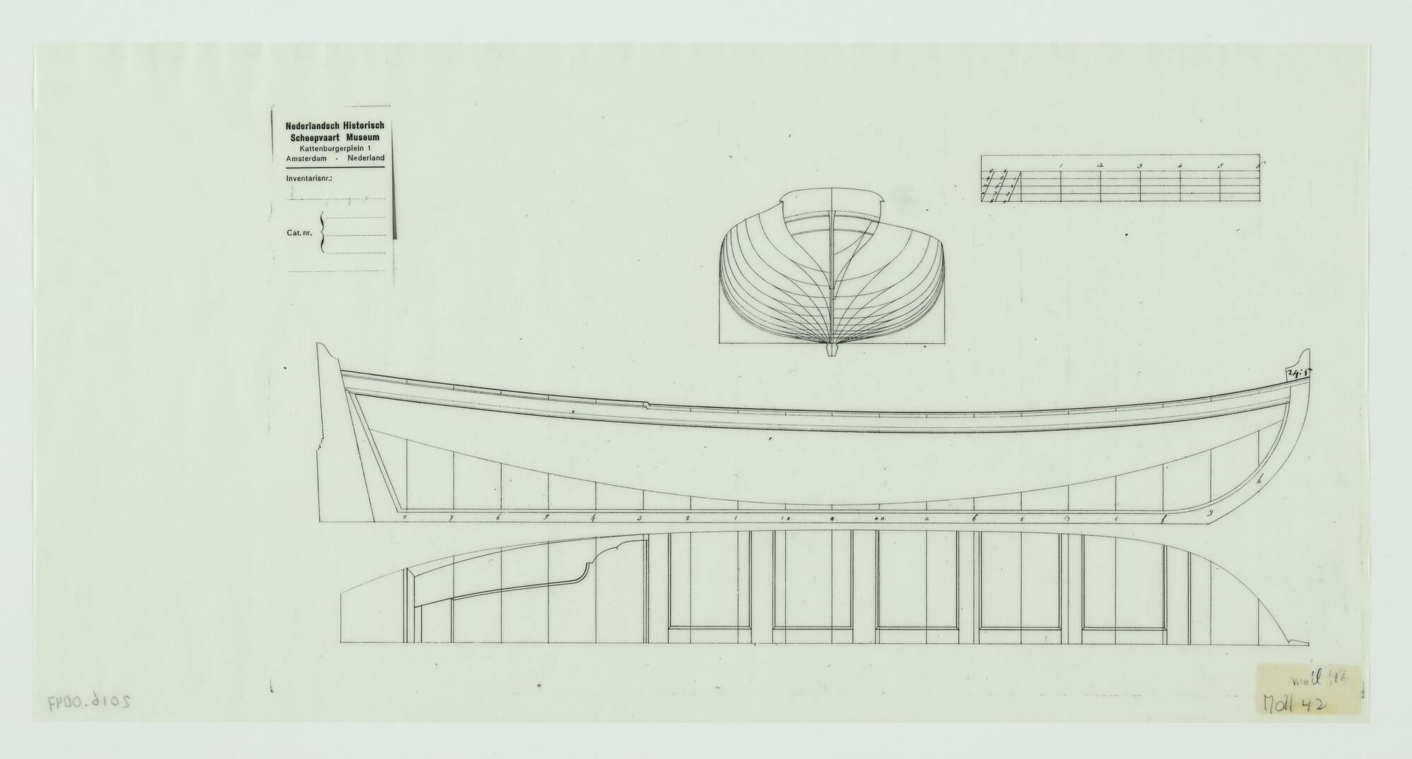 Lijnenplan, spantenraam en aanzichten van een jacht ...