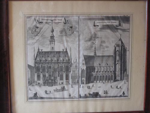 stadhuis en afgebrande kerk, Veere; gravure