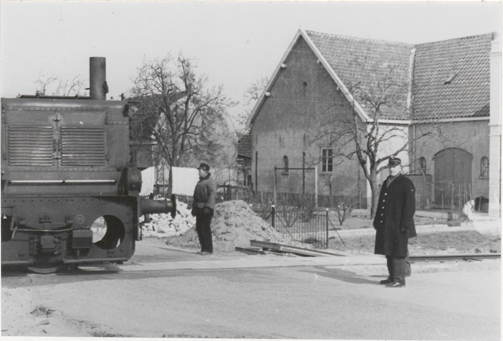 Twee mannen in spoorweguniform bij diesellocomotief,...