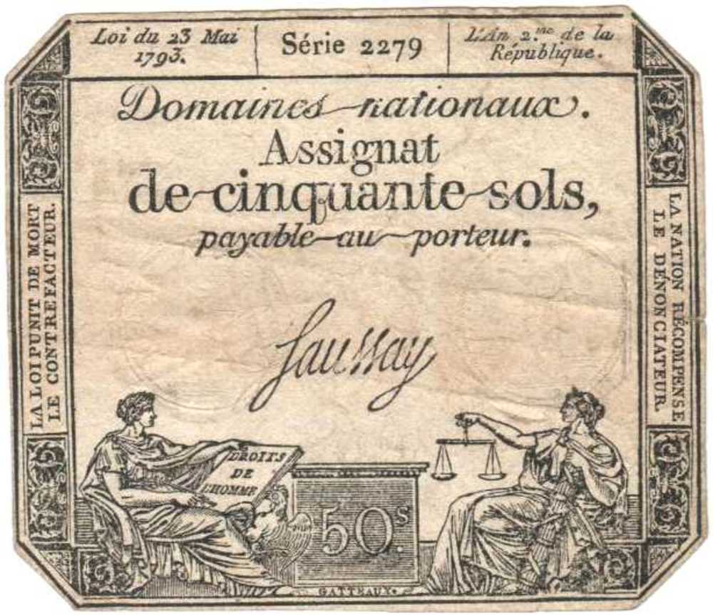 Assignat van dun papier met een waarde van 50 sols; ...